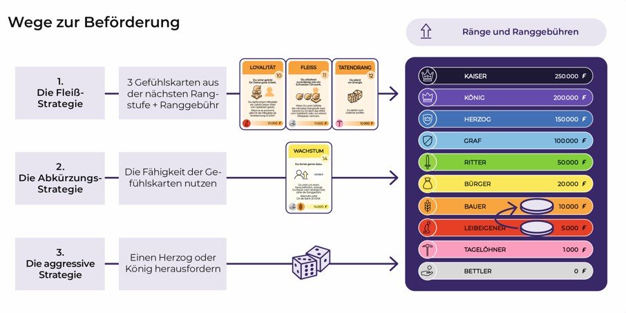 Zu Beginn des Spiels befindest Du Dich unten in der sozialen Hierarchie. Dein Ziel ist es, als erster den höchsten Rang zu erklimmen und Kaiser zu werden. Das ist ein spannender Weg. Um das zu schaffen, musst Du mit den anderen Spielern verhandeln, Beziehungen entwickeln und nutzen; außerdem hilft es Dir zu verstehen, wie Gefühle miteinander wirken.