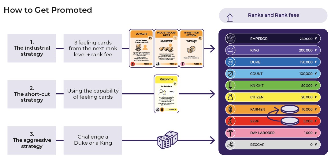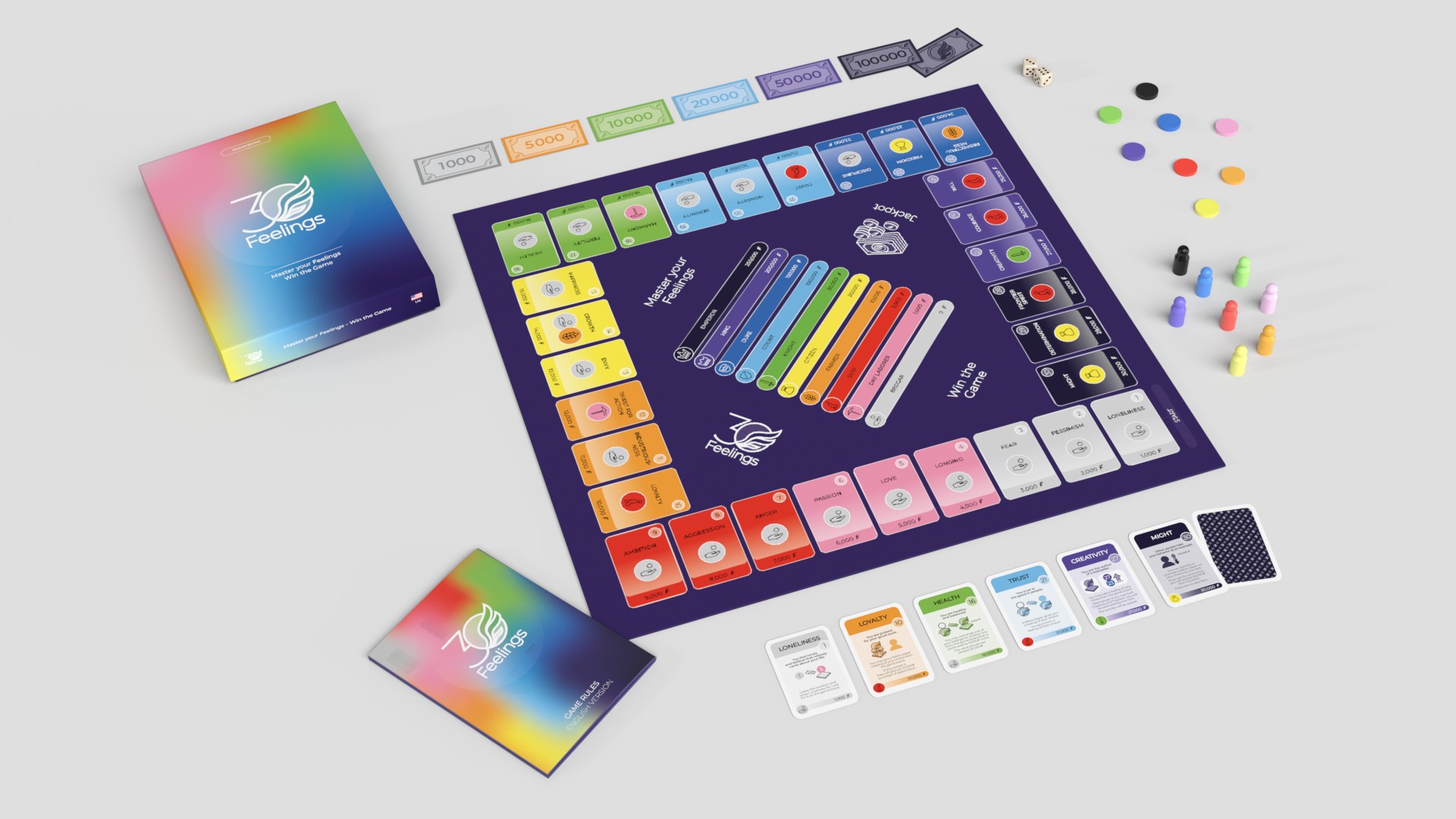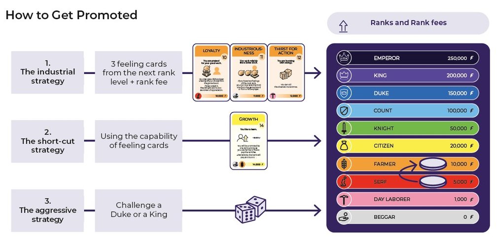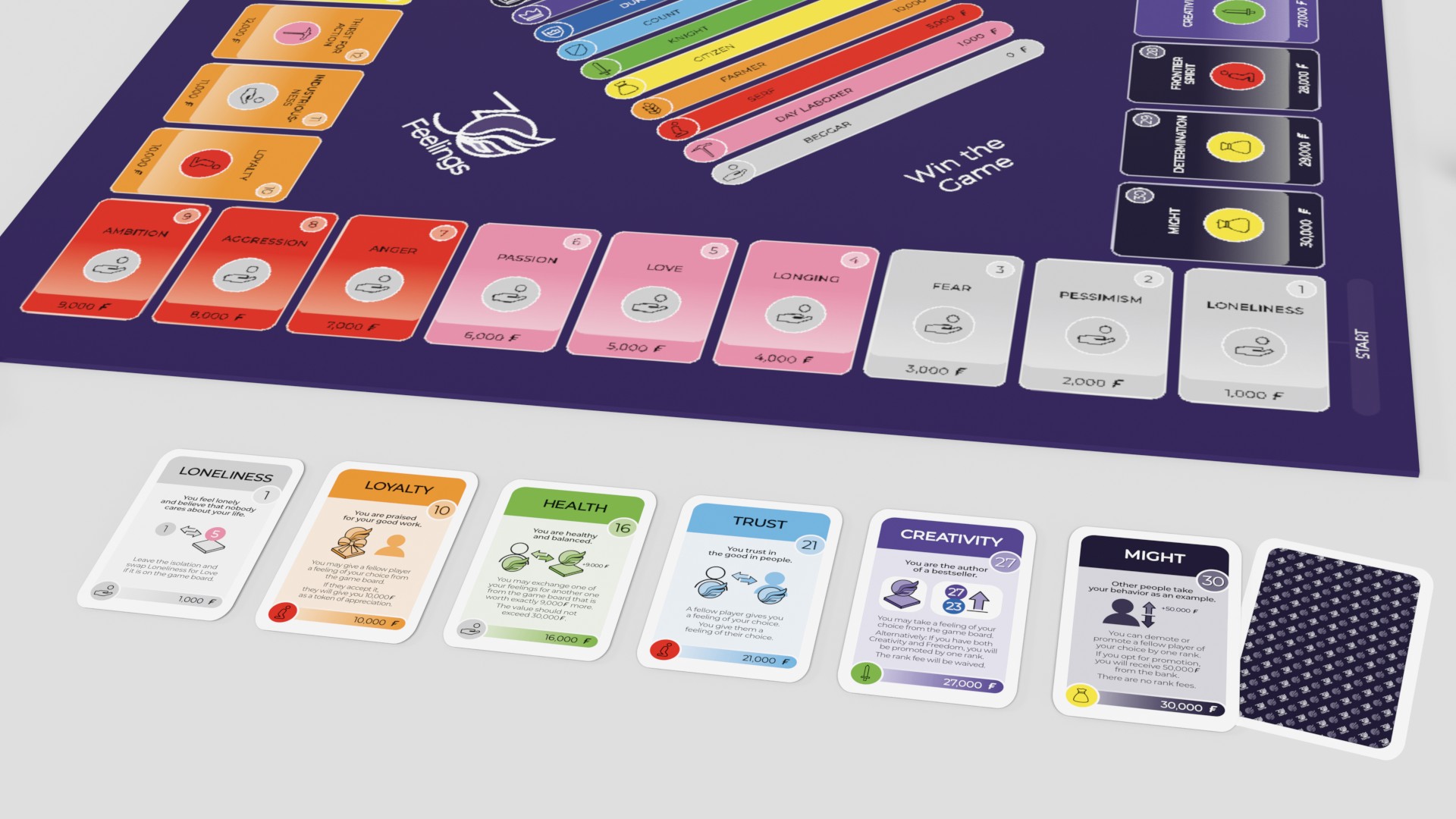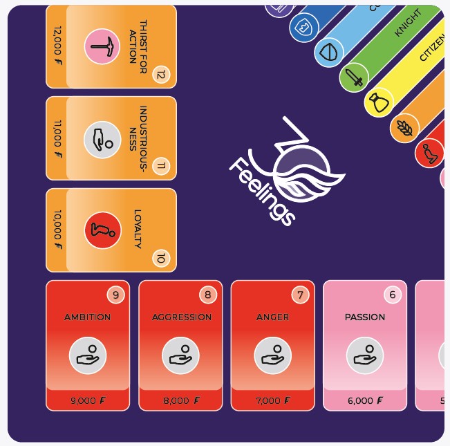 30 Feelings is a social board game that takes you on a journey through the entire spectrum of human emotions. At the beginning of the game, you are at the bottom of the social hierarchy. Your goal is to be the first to climb to the highest rank and become emperor. That is an exciting path. To achieve this, you must negotiate with the other players, use relationships, and understand how emotions interact. 30 Feelings combines luck, strategy, emotional intelligence, and negotiation skills. The game is perfect for teenagers and adults who dare to break taboos around emotions.